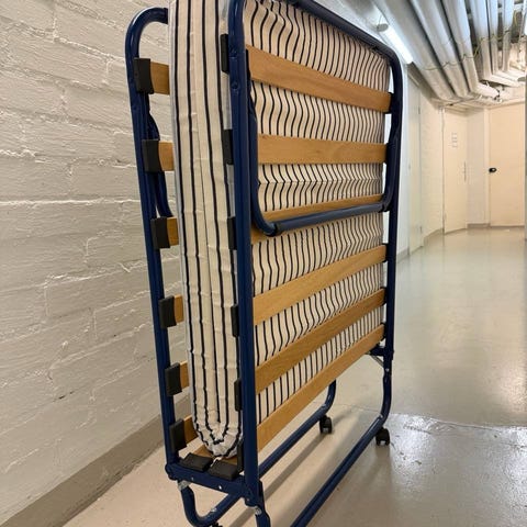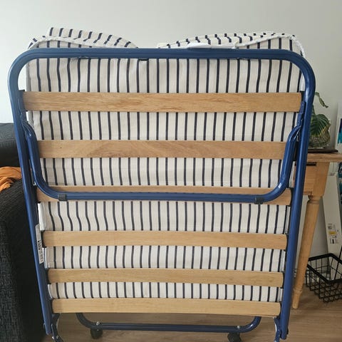 IKEA Sandvika taitettava vierassänky. Sängyssä on sinivalkoraidallinen patja ja sininen metallirunko, joka voidaan taittaa kasaan säilytystä varten. Patja on kiinteästi sänkyyn kuuluva, eikä päällistä voi irrottaa pesua varten, pesulapussa on vain pintapuhdistusohjeet. Sopii tilapäiseen nukkumiseen esimerkiksi vieraille tai varavuoteeksi. Tarkemmat mitat eivät ole tiedossa, mutta sänky on yhden hengen kokoluokkaa.