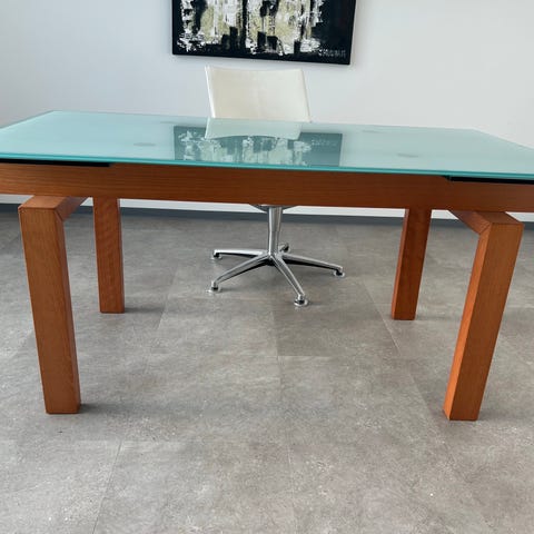 Hienoa korkeussäädettävä design työpöytä myytävänä. 1,2 cm paksu laskikansi sekä pukkijalat. Lasin kulmassa pieni kolhu, lasista ei puutu palaa. Jalat erinomaisessa kunnossa ja kaikki toimii.