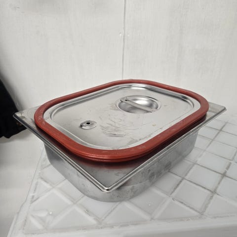 Ruostumattomasta teräksestä valmistettu suorakaiteen muotoinen Metoksen allas. Altaassa on tasainen pohja ja vahvikekiskot sekä sivussa liitäntä, johon on kiinnitetty muovinen letku. Soveltuu esimerkiksi nesteiden keräämiseen tai varastointiin työpajassa tai muussa teknisessä käytössä.
