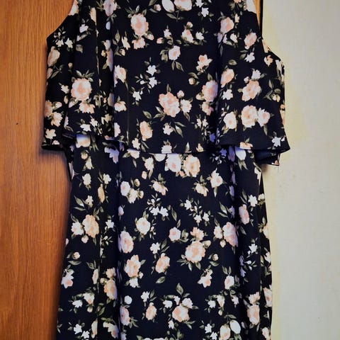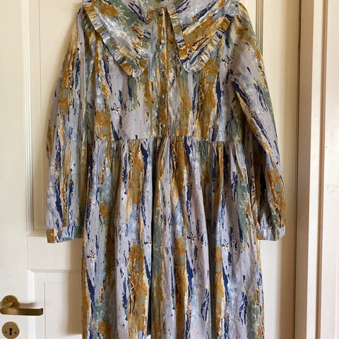 Vähän käytetty, hyvässä kunnossa. Kaunis joustava rento monenkokoiselle sopiva malli, kauniit pussimaiset hihat, nappi niskassa, frillahelma, hieman kreppimäinen kangas