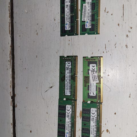 RAM-muistit tietokoneeseen. Useita vihreitä muistimoduleita, joissa kullatut liittimet. Sopivat pöytätietokoneeseen, tarkemmat tiedot kuten kapasiteetti, kellotaajuus ja muistityyppi selviävät moduuleissa olevista tarroista ja merkinnöistä. Soveltuvat esimerkiksi tietokoneen keskusmuistin laajentamiseen tai vaihtoon yhteensopivissa kokoonpanoissa.