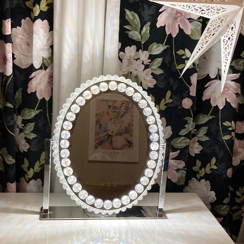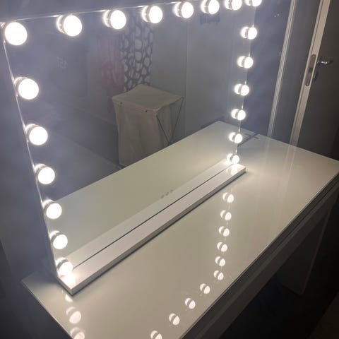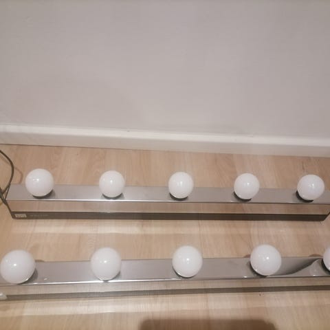 Uudenveroiset meikkausvalot, 2 kpl hintaan 40 € ja reunoilta hiottu peili kooltaan 60x70 cm hintaan 30 €. Peili on yhtä korkea kuin valaisimet eli 60cm.