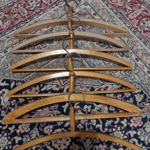 Hyväkuntoiset ja siistit puiset vintage housunripustimet housuhenkarit 7 kpl. Sisäosa punaista samettia.