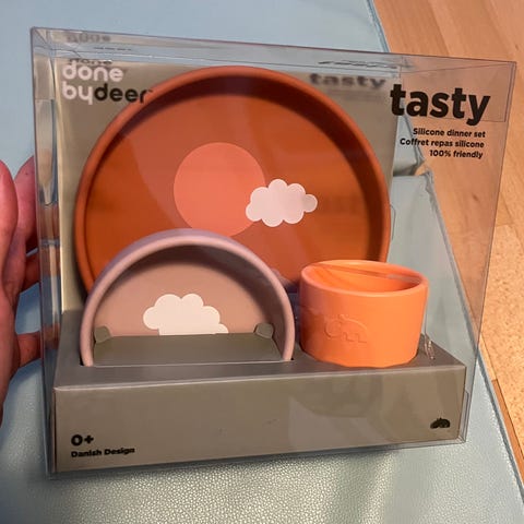 Myydään taaperon Done by Deer ruokailusetti. Settiin kuuluu nelilokeroinen lautanen, haarukka ja veitsi sekä kuppi. Mukaan kaksi muovilusikkaa sekä imukuppi, jolla saa lautaset ja kulhot pysymään pöydässä kiinni. Aterimissa kulumaa ja lautasen pinnalla naarmua, mutta muuten ehjä ja siisti setti seuraavalle.