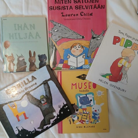 Kirjoista kannet kuluneet, mutta muuten ehjät.