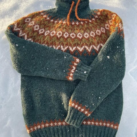 Islantilainen villapaita, koko XL/XXL. Neulottu lettlopista, korotettu niska parantaa istuvuutta. Materiaalina 100% islanninvilla, lämmin mutta hyvin hengittävä.