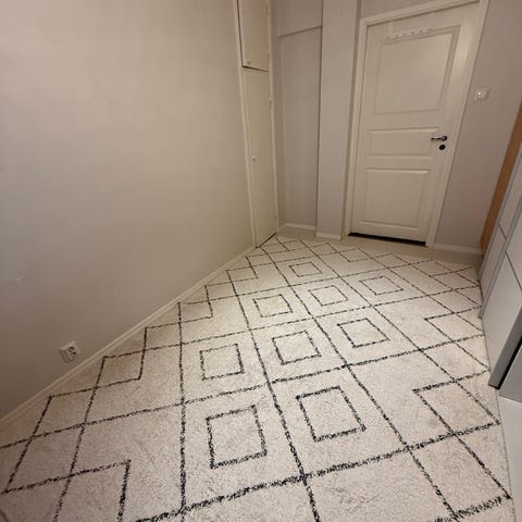 Hyväkuntoinen keväisen värinen ellokselta ostettu Emilia ryijymatto. Puuvillaa. Konepesu, jos mahtuu pesukoneeseen.