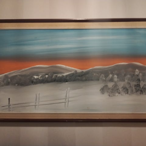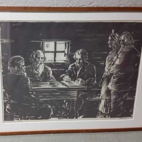 Kauniin rauhallinen luontokuvaus matrikkelitaiteilija Aukusti Tuhkalta (1895-1973) vuodelta 1950. Lasin alla hyvin säilynyt taideteos on kehysten päältä mitattuna korkeudeltaan noin 45 cm ja leveydeltään noin 55,5 cm