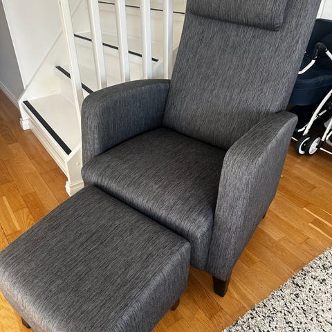 Ikea nojatuoli ja rahi harmaalla kangasverhoilulla. Nojatuolissa korkea selkänoja, sivutuet ja käsinojat, jotka tarjoavat tuen istuma-asennolle. Rahi on suorakaiteen muotoinen ja verhoiltu samalla harmaalla kankaalla kuin nojatuoli. Molemmissa on tummat jalat. Sopii olohuoneeseen tai luku- ja lepohetkiin istuinryhmän osaksi.