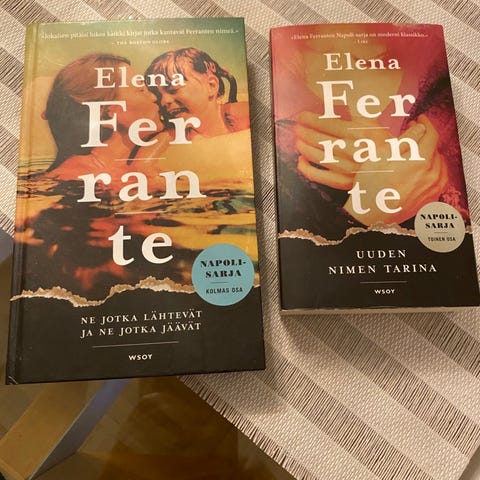 Elena Ferrante Napoli-sarja romaanit suomeksi. Pakettiin kuuluu neljä teosta samasta kirjasarjasta, kustantajana WSOY. Kirjoista kaksi ensimmäistä ovat pehmeäkantisia ja kaksi viimeistä kovakantisia. Sivuja sarjassa on 1830. Sopii luettavaksi yhtenäisenä romaanisarjana, jossa seurataan samoja henkilöitä useamman osan läpi.