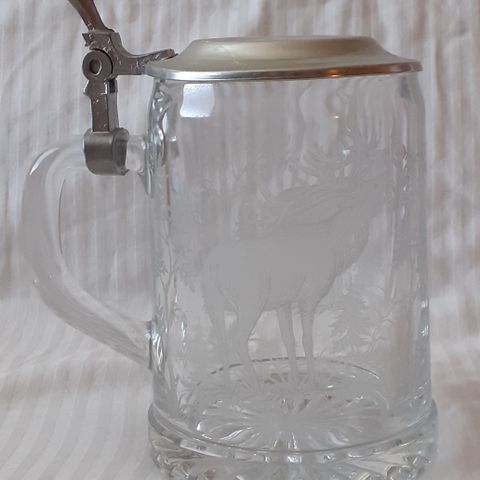 korkeus 15cm, suuaukon halkaisija 8cm. Kahdessa lasissa kuvioituna fasaanit ja jänikset, tinakansissa kaiverrukset: AD 1987 ja RISTO 3.7.1996. Kolmannessa lasissa sorsia, kannessa ei kaiverrusta yhteensä 25€