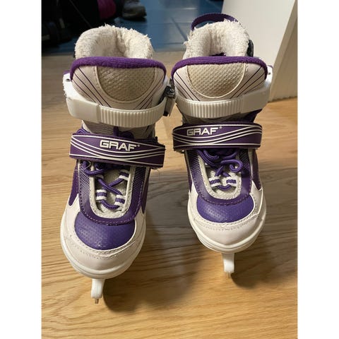 Graf lasten säädettävät luistimet, koko 30-33 Väri musta/valkoinen. Terä on tarkoitettu yleisluisteluun. Kengässä on säädettävä rakenne, jossa soljet helpottavat pukemista ja istuvuuden säätöä. Päällinen on valmistettu synteettisestä materiaalista ja verkkokankaasta, sisäosa on pehmustettu käyttömukavuuden parantamiseksi.