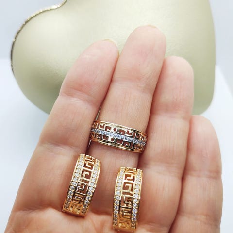 Naisten korusetti, johon kuuluu sormus ja rannekoru. Molemmat korut on valmistettu muusta materiaalista ja niissä on kultaisia yksityiskohtia. Sormus ja rannekoru ovat joustavaa mallia, mikä helpottaa pukemista ja sopivuutta eri kokoisiin sormiin ja ranteisiin. Korut sopivat arki- tai juhlakäyttöön neutraalin värityksensä ansiosta.