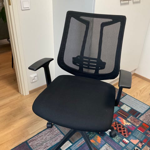 Tuolissa on hieman kulumajälkiä istuimessa ja käsinojissa. Pyörät liikkuvat sujuvasti. Yleisilmeeltään siisti, mutta käytön jäljet ovat havaittavissa.
