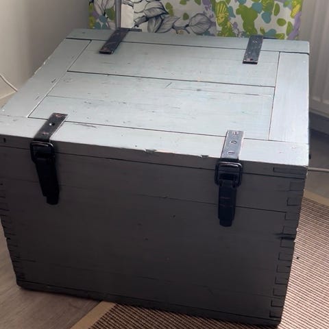 Vanha puinen militaria arkku. Mitat pituus 62 cm, korkeus 31 cm ja leveys 24 cm. Molemmilla sivuilla kantokahvat. Nouto.