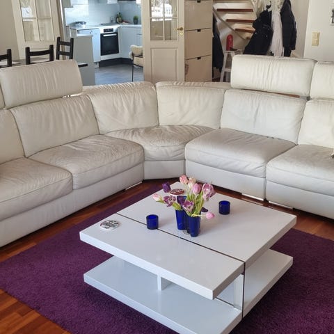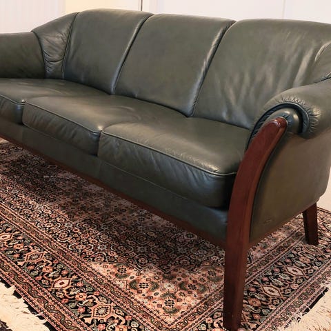 Materiaali bonded-nahka. Selkänojan tyynyt saa vetoketjukiinnityksellä kiinni selkänojaan. Pohjassa keskellä yksi tukipiste reunajalkojen lisäksi. Muutama hieman kuluneempi kohta, yleisilme siisti.