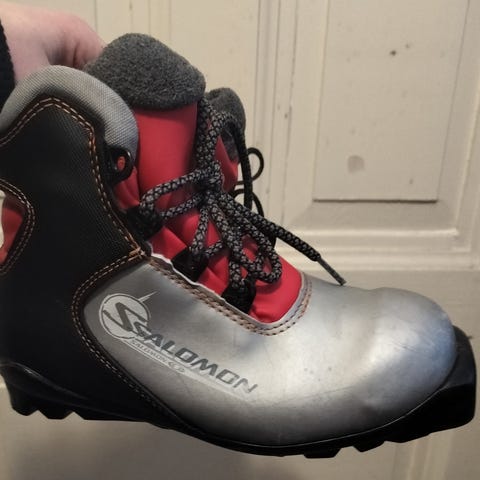 Hyväkuntoiset ja siistit Salomon naisten monot koko 38. Monot ovat muuten hyväkuntoiset, mutta yksi nauha kiinnike on irronnut. Siitä tarkempi kuva.