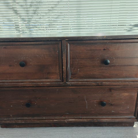 Tummanruskeaksi petsattu käsintehty lipasto, ollut tv-tasona. Takaseinässä ja toisessa laatikossa porattu reikä johdotuksia varten (kts. Kuva). Pinnat kuluneet.