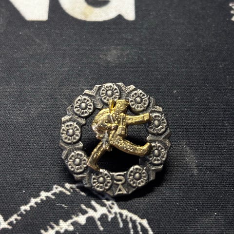 Urheiluaiheinen rintamerkki, jossa keskellä on kultaisen värinen juoksijahahmo.