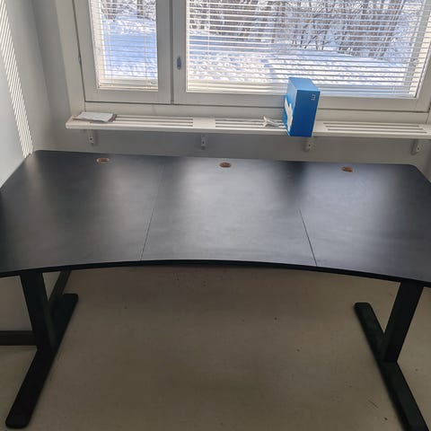 Käytetty reilusti 2 vuotta. Pieni rikko näkee viimeisessa kuvassa. Kaapelit saa hienosti pakattu pöydän alapuolelle. Korkeus saa vaihdettu 68-78cm ruuvilla.