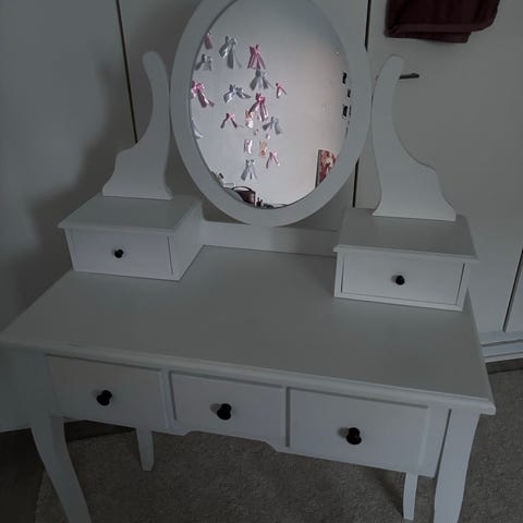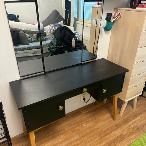 Myydään pöytä, jossa mukana tulee peili ja valot. Käytön jälkeä löytyy, mutta ehjässä kunnossa