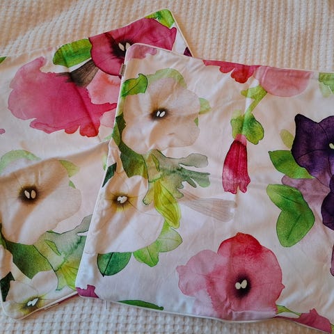 Myydään settinä 2 kpl Pentikin tyynynpäällisiä. Molemmat ehjiä ja hyväkuntoisia, vetoketjusuljenta. Hinta molemmista yhteensä 26 e.