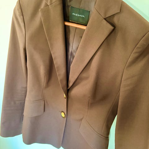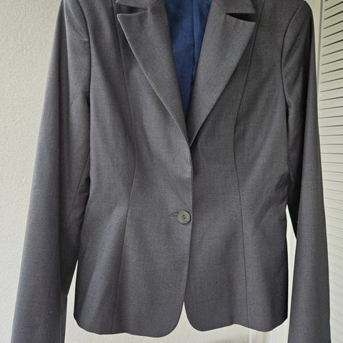 Harmaa Andiata housupuku, hoikka malli, pesulakäynnin jäljiltä. Jakku: pituus 64 cm, shaalikaulus, kevyet olkatoppaukset