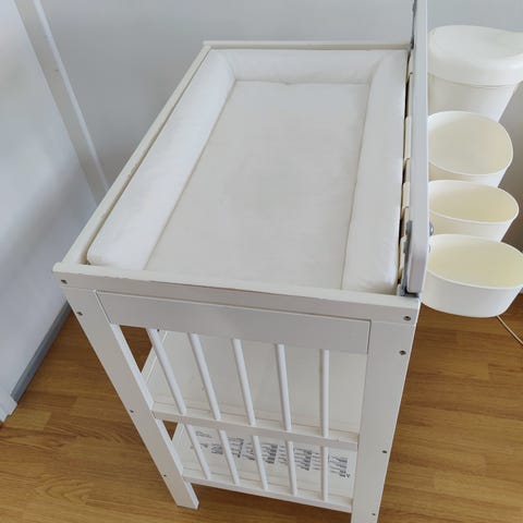 Stokke hoitopöytä, väri valkoinen. Hoitotaso ja useampi hylly tasojen alla tarvikkeiden säilytykseen. Sivussa erillinen säilytyskori esimerkiksi vaipoille ja hoitotuotteille. Soveltuu vauvan hoitoon ja tarvikkeiden järjestämiseen lastenhuoneessa.