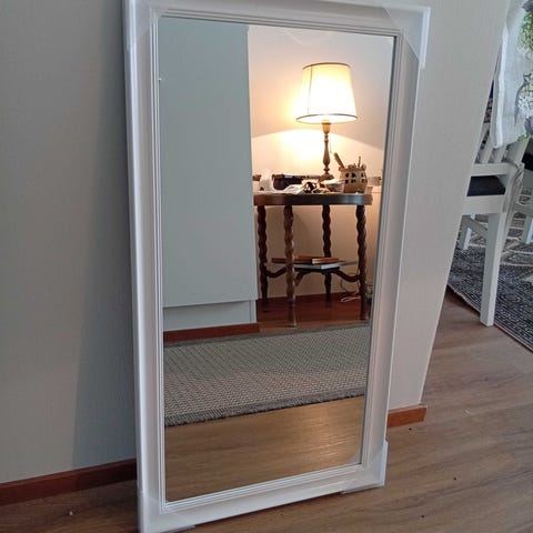 Kevyt, muovikehyksinen peili. Voi laittaa seinään, tai mukana tulevilla metallikoukuilla roikkumaan oveen.