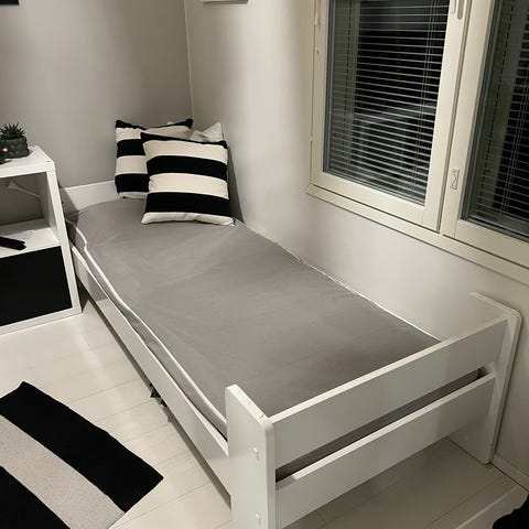 Myytävänä Unipuun sänky. Laidat otettu matalaksi toisesta päästä ja tarroja yhdessä jalassa (näkyy kuvassa).