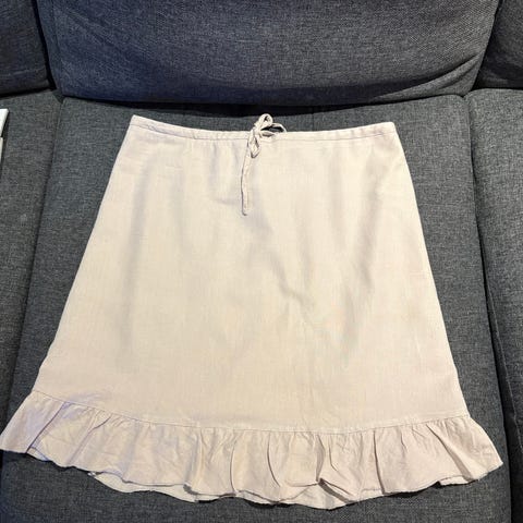 H&M naisten joustava pliseerattu hame, koko XL. Väriltään vaaleanvihreä. Materiaali polyesteriä 95%, spandexia 5. Painava, laskeutuva kangas. Helma leikattu, ei päärmettä. Kankaassa on näkyvissä pieni tahra, joka on merkitty kuvaan 5. Soveltuu arki- tai toimistokäyttöön erilaisten alaosien kanssa.