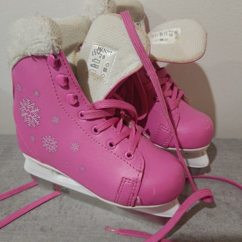 Pinkit Minni luistimet kokoa 32. Pohjallisen mitta noin 22,5cm. Jotain käytönjälkeä, vielä menevät seuraavalle =) puutteet:kts.kuva 4