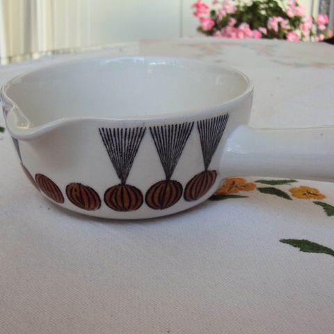 Myytävänä kaunis ja ajaton Arabian valmistama reimari sarjan kastikevene/kastikekaadin.sarjan on suunnitellut Anja Jaatinen-Winguist ja koristekuvion on suunnitellut inkeri leivo. Reimari sarja on tunnettu merellisestä tunnelmastaan ja tyylikkäistä musta-oranssi-raidoistaan. Tämä tuote on loistava lisä joko käyttöön tai keräilijän hyllyyn. Merkki:Arabia finland, sarja:reimari, mitat korkeus 8cm, pituus 19.5cm ja leveys 12cm. Kunto erinomainen, täysin virheetön. Pohjaleima:Arabia finland reimari.