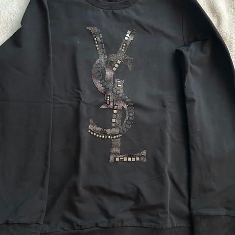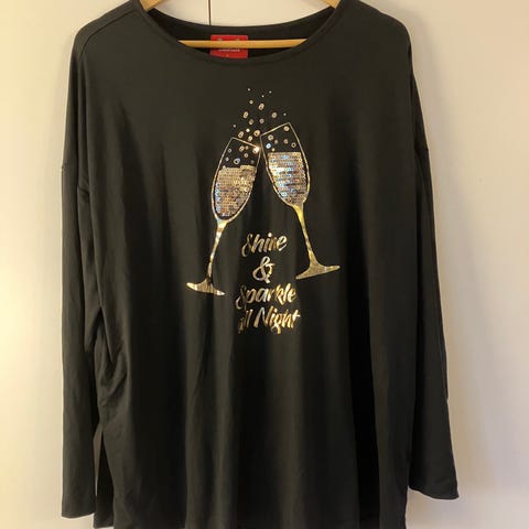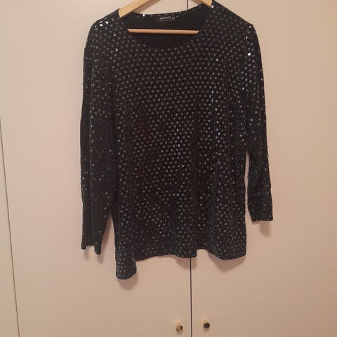 Nyt on kimallusta 🤩 Musta, paljetein (paljetit ommeltu kiinni) ja tekstein varustettu, puuvillainen collegepusero. Mittoja kuvassa.