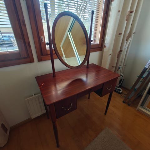 Myydään Muuramen kampaus/meikkipöytä integroidulla peilillä ja rahilla hyvään kotiin. Pöytä on ollut erittäin pienessä käytössä - viimeiset 30 vuotta avaamattomana. Peili on ehjä.