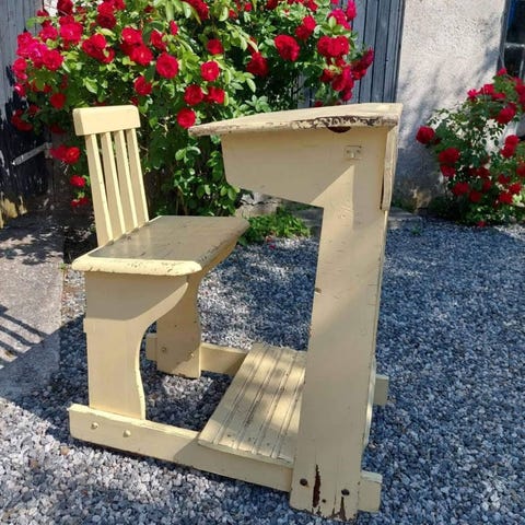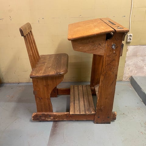 Puinen vanha koulupulpetti tuolilla