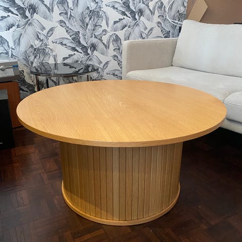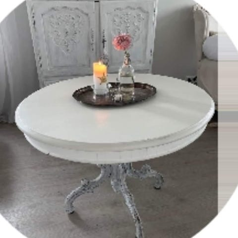 Pyöreä puinen sohvapöytä, jossa sorvatut jala. Sopii olohuoneen sohvapöydäksi. Tukeva ja ehjä.