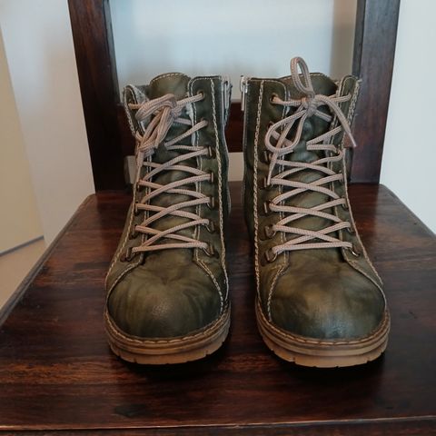 Rieker talvikengät, koko 41, muutaman kerran käytetyt. Väriltään mustat nilkkapituiset kengät, joissa on paksu kuvioitu kumipohja ja sivussa vetoketjut pukemisen helpottamiseksi. Edessä vetoketju koristeena. Päällinen on nahkaa ja sisäpuoli pehmeää, lämmintä vuorimateriaalia villapohjallisella. Soveltuvat viileään säähän arkikäyttöön. Veisussa. MMM