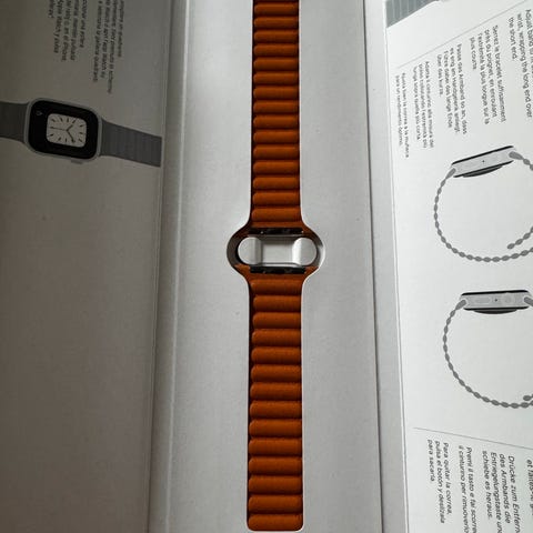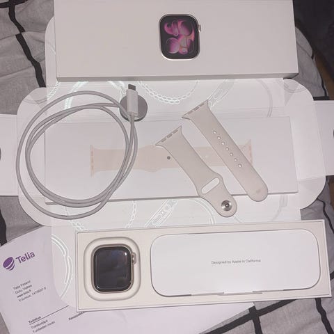 Ylimääräiseksi jäävä Apple Watch Series 9, 41 mm, starlight. Molemmat mukana tulevat rannekkeet käyttämättömiä. Mukaan myös latausjohto ja alkuperäispakkaus.