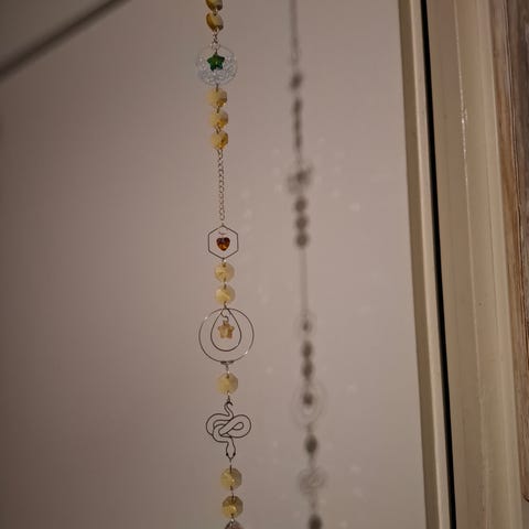Aurinkosieppari Käärme korulla ikkunaan roikkumaan aurinkoiselle puolelle ja aurinko heijastaa pieniä valopilkkuja seiniin ja kattoon kristalleista