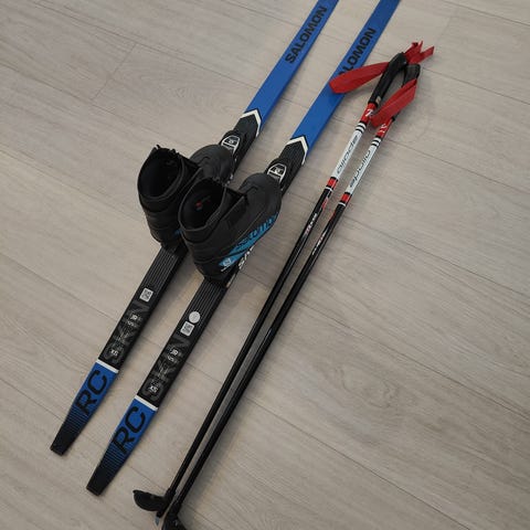 Fischerin suksipaketti. Kovasti hiihdetty mutta erittäin käyttökelpoiset vielä.