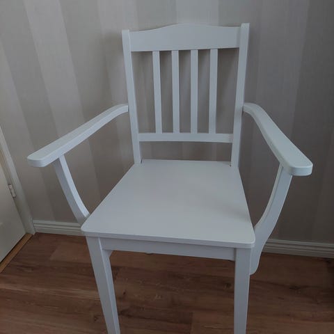 Viime marraskuussa Vekestä ostettu Juhani-niminen, valkoinen seniorituoli. Tukeva ja korkea tuoli, massiivikoivua. Uudenveroisessa kunnossa.