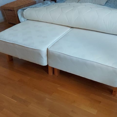 Myydään runkopatjat korkeilla 23cm jaloilla ja melkein uudella petauspatjalla. Runkopatjat ovat jo aikaa nähneet ja niissä on pari kellastunutta länttiä. Petauspatja on ostettu 3kk sitten Sotkasta 200€. Patjansuojus ollut käytössä. Nouto Vantaanlaaksosta.