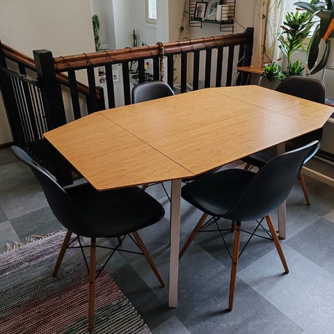 Myydään muuton alta Ikean jatkettava bambuinen ruokapöytä valkoisilla metallijaloilla. Kokonaisuudessaan pöydän pituus on 138cm, leveys 80cm, ja korkeus 73cm. Päädyt alhaalla mitat ovat 80cm x 74cm. Emme valitettavasti pysty auttaa kuljetuksessa, koska emme omista autoa, joten vain nouto. Autamme kyllä kantamaan pöydän asunnosta. :) tuolit ovat Jyskistä ja ne saa mukaan jos haluaa. Ovat muuten ok kunnossa mutta pohjan musta verhoilukangas on vähän hapertunut.
