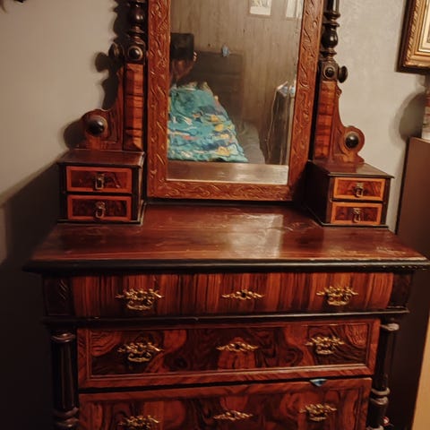 Kunto hyvä, pientä ajan patinaa tietysti löytyy sieltä täältä. Pikkukaapeissa tuoksua todennäköisesti hajuvesistä tai tuoksukynttilöistä tms. Muutoin hajuton ja siisti. Avaimet löytyy.
