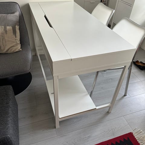 Myydään Fjällbo työpöytä/läppäripöytä. Toisessa päässä pyörät, joten helppo liikutella. Kansi puuta. Pöydässä lokero läppärille tai tavaroille.