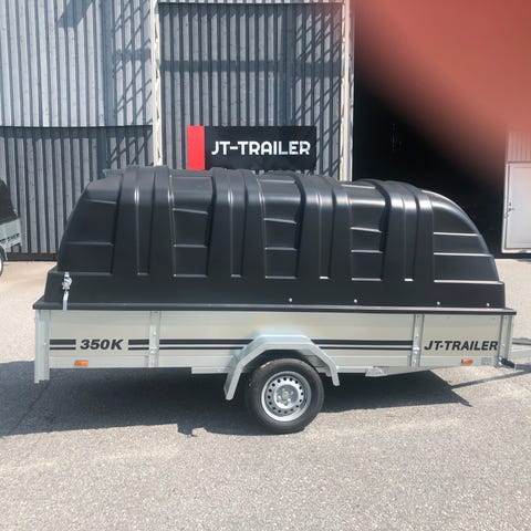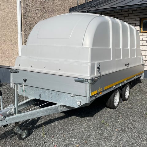 Kuvan siistikuntoinen ja kauttaaltaan moitteettomassa kunnossa oleva kippaava Respo 1500 kuomukärry (vm 2020) 420 mm korkeilla laidoilla.