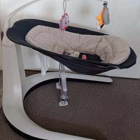 Tiny Love vauvankeinu harmaalla kangaspäällysteellä. Keinussa on pehmustettu vaalea sisus ja turvavyö vauvan kiinnittämistä varten. Yläosassa on ohjauspaneeli, josta voi säätää äänitoimintoja. Soveltuu vauvan lepäämiseen ja rauhoittamiseen sisätiloissa. Keinu sijoitetaan lattialle vakaalle alustalle ja sitä käytetään valmistajan ohjeiden mukaan.