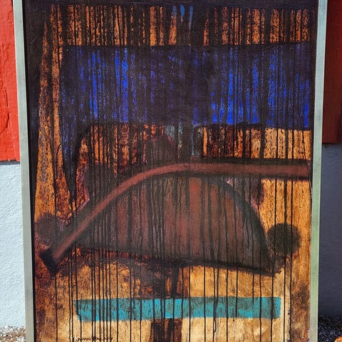 Näyttävä maalaus , sekatekniikka levylle, koko n. 85 cm x 70 cm raameineen. Teoksen nimi Juoru , Palmugallerian leimat takapuolella. Toimitus neuvoteltavissa