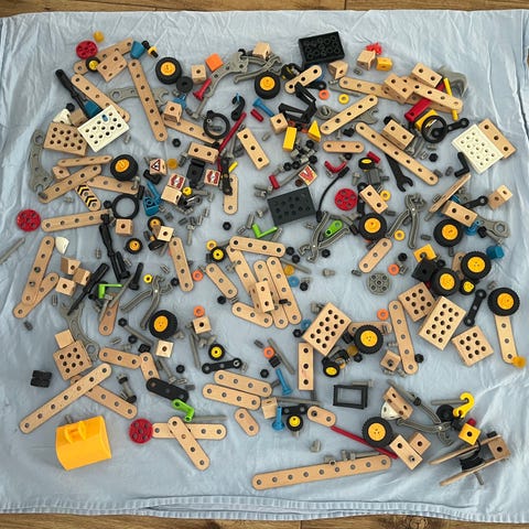 Kiva pienen lapsen rakennussarja jossa pääsee kiinnittämään muttereita ja ruuveja. Tuskin kaikki osat on paikalla mutta ei ole tullut näitä vastaan muista lelukoreista joten kuvan mukaisella määrällä mennään. Osissa ei sinänsä varmaan vikaa, vähän leikitty, pahvilaatikko hieman rikki. Haku, en lähetä.